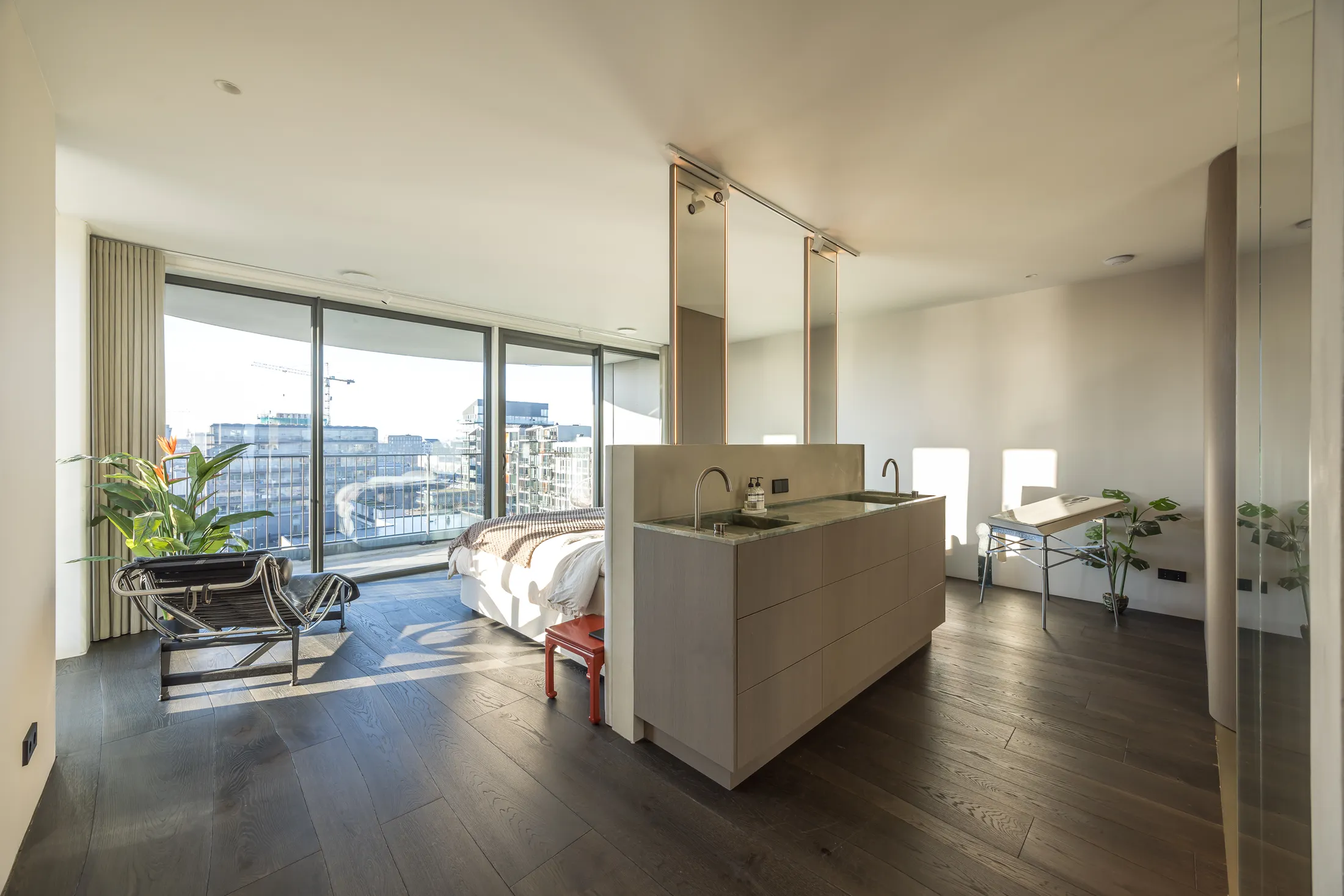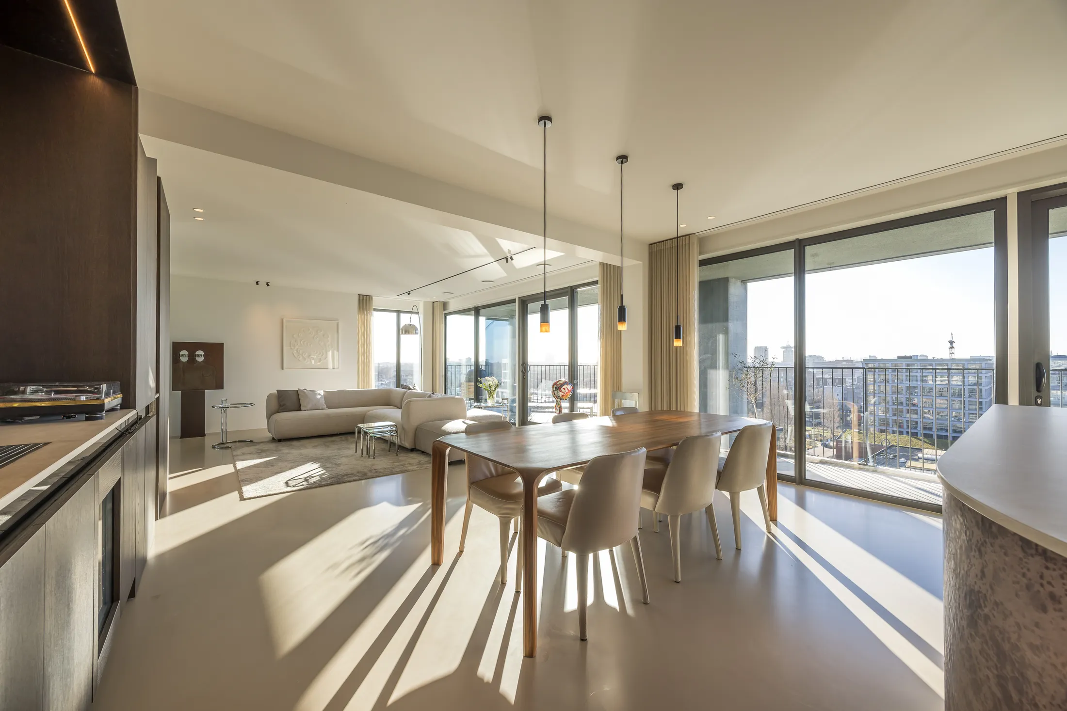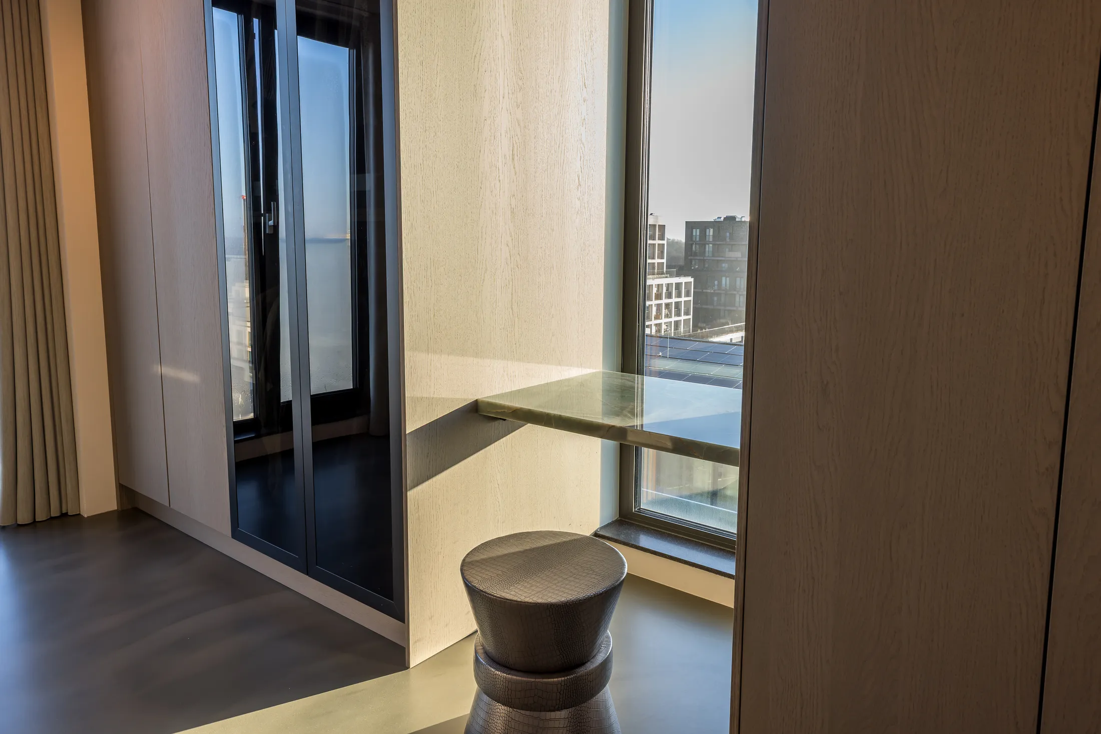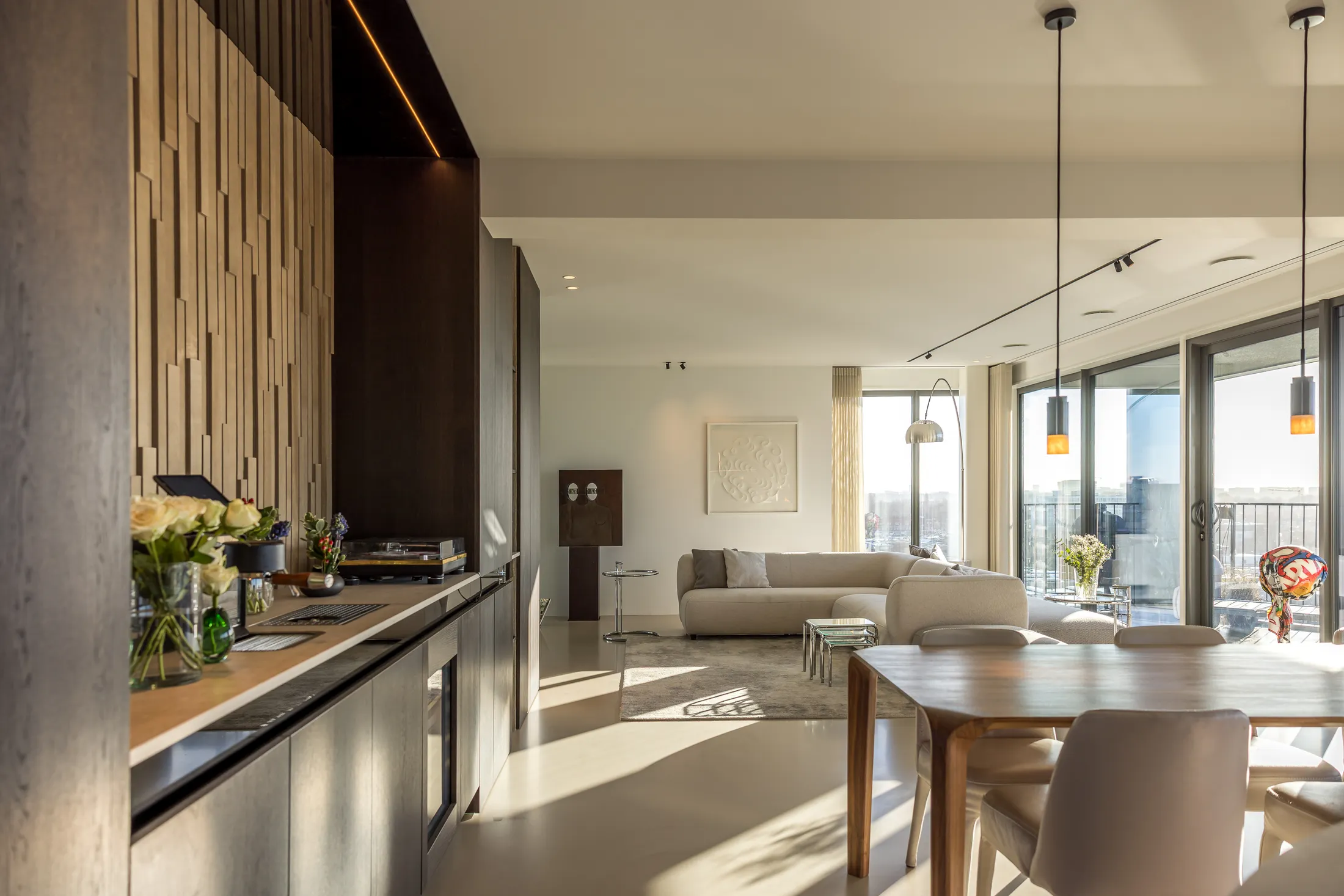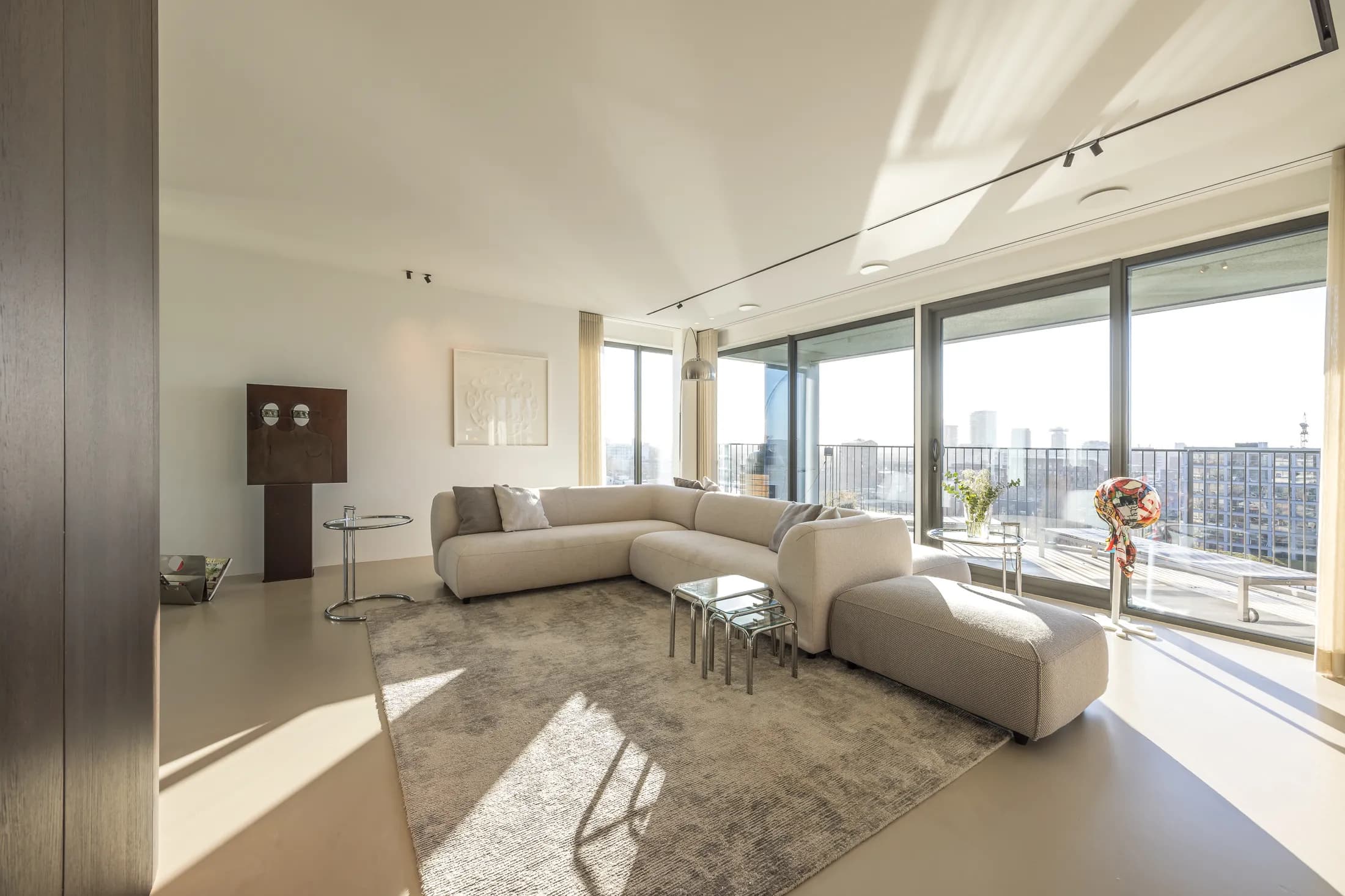 Een penthouse met adembenemend uitzicht vraagt om een interieur dat de aandacht niet afleidt maar juist versterkt. Voor dit project kozen we bewust voor een palette van warme neutralen, natuurlijke materialen en strakke lijnen. Het resultaat is een ruimte die sereen aanvoelt en waarin elk detail bijdraagt aan het totaalplaatje.