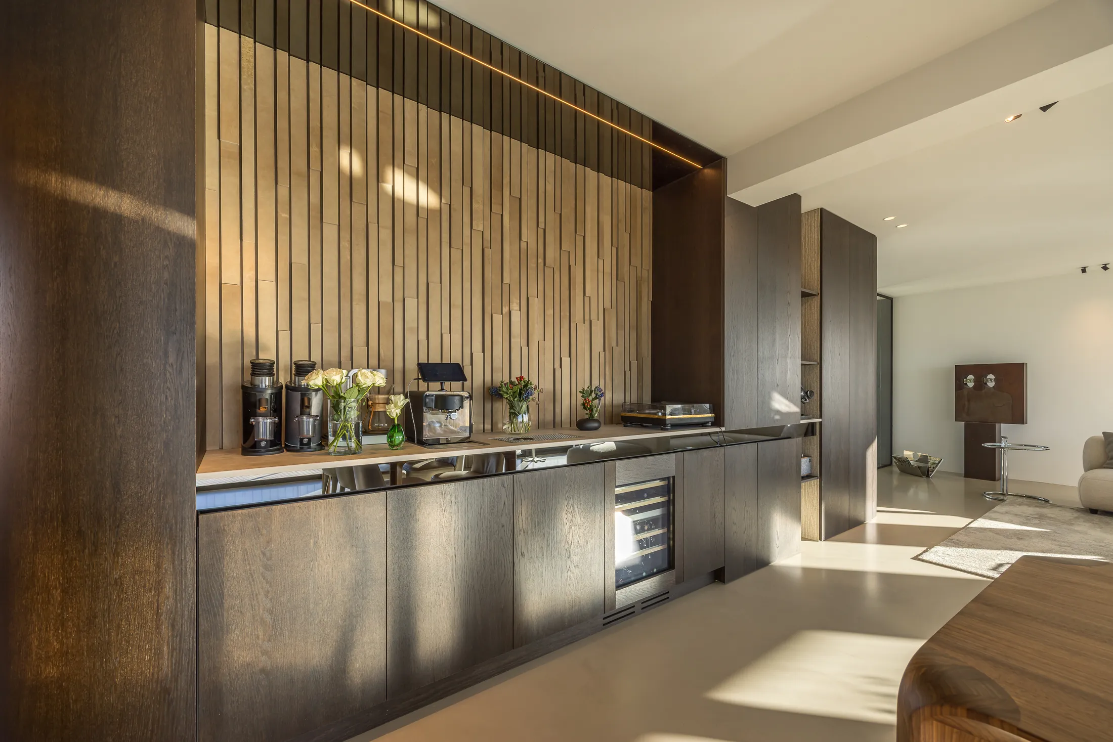 Elke kast, plank en nis is op maat gemaakt. Het meubilair volgt de architectuur van de ruimte, waardoor er een vanzelfsprekende harmonie ontstaat. Functioneel én esthetisch, niets is overbodig.