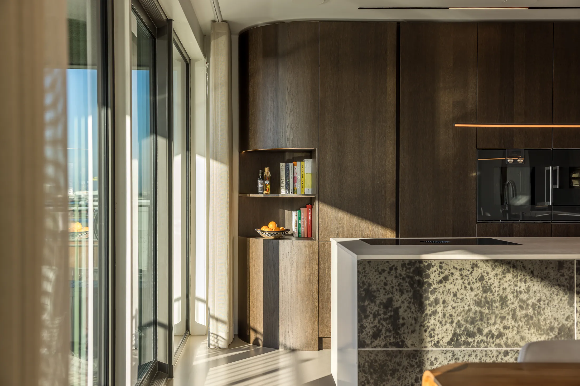 Elk materiaal, van het eikenhout tot het natuursteen, is geselecteerd op zowel tactiliteit als visuele warmte.