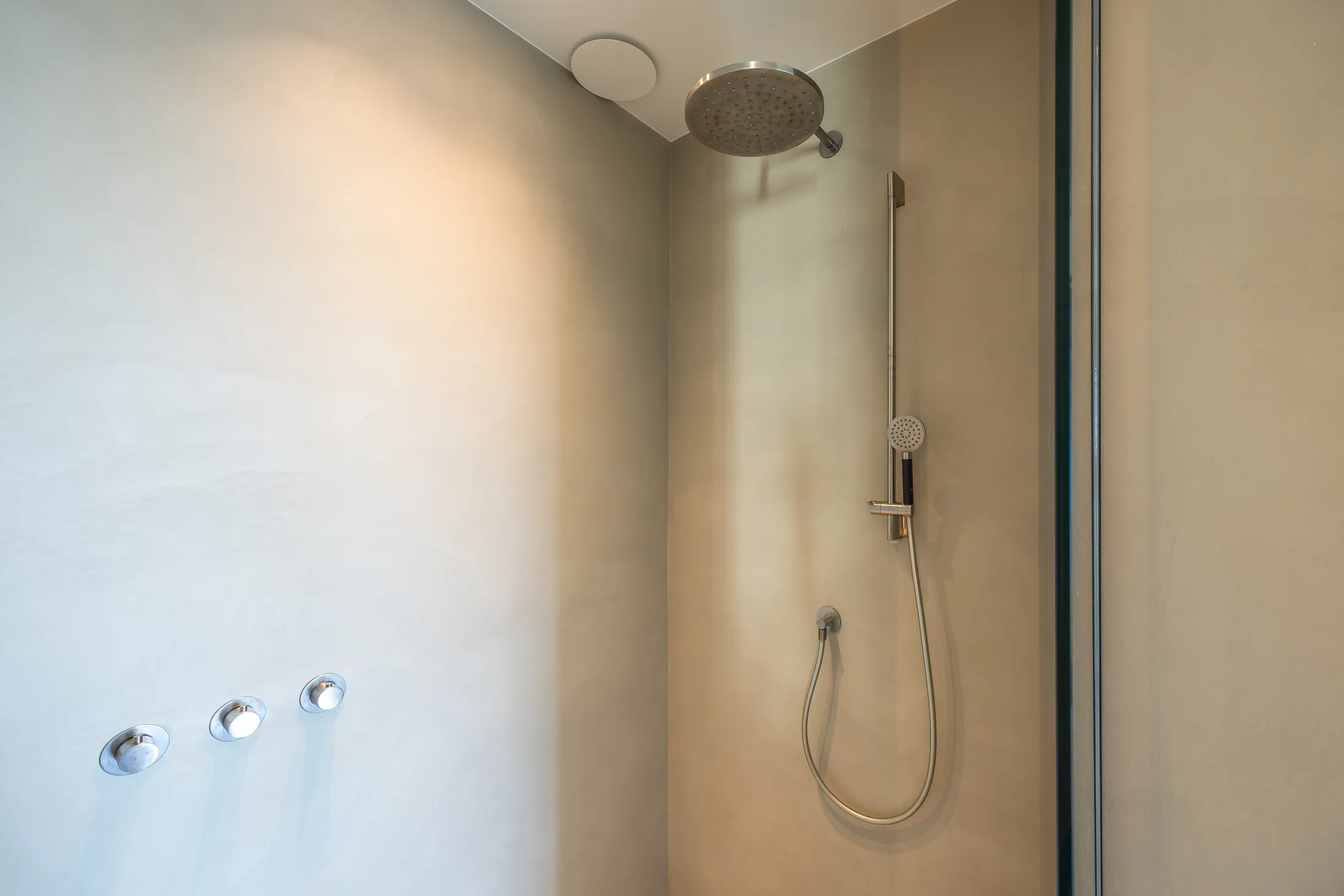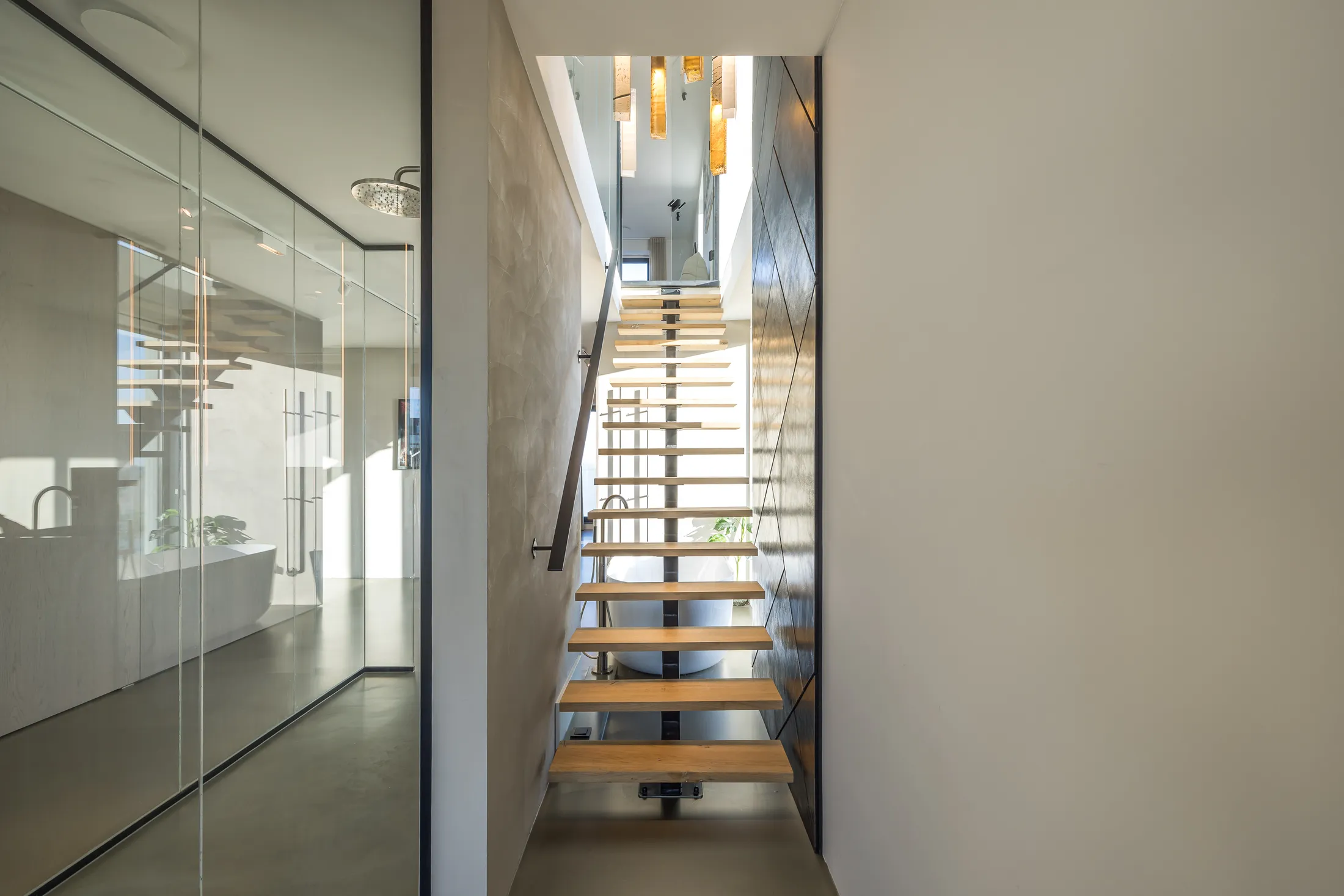 De badkamer is uitgevoerd in groot formaat natuursteen met zwevend sanitair en inbouwkranen. De vrijstaande badkuip vormt het middelpunt van de ruimte, gepositioneerd voor maximaal uitzicht. Sfeerverlichting en vloerverwarming completeren de spa-ervaring.